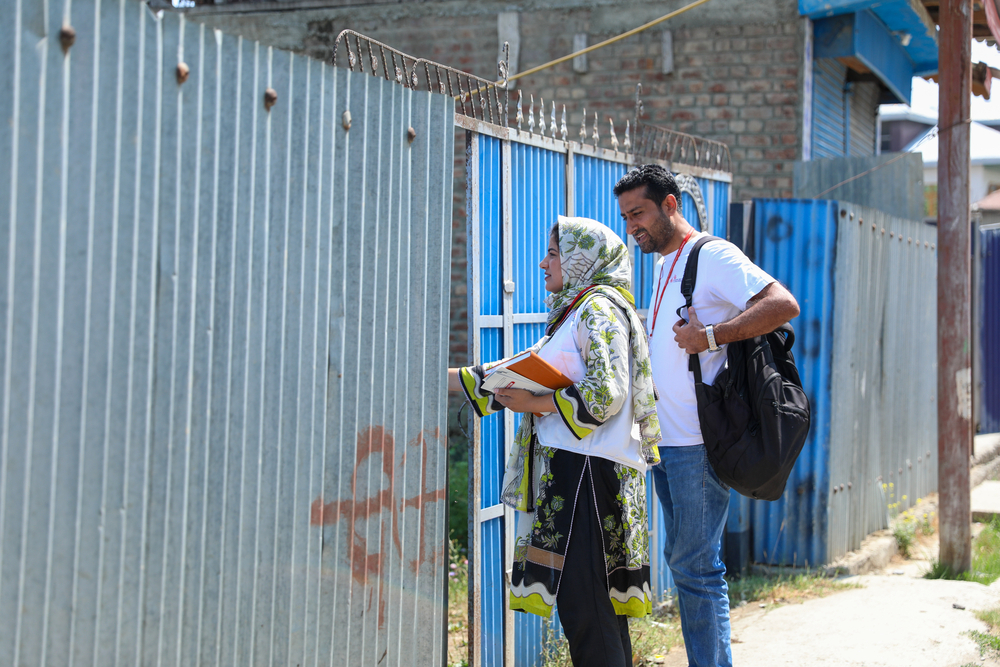 At a home in Bomai, Baramulla, Zainab and Mudasir Ahmad Lone are invited inside by a woman in her forties. The living room is simple but spotlessly clean, with cushions arranged on the floor around a low table.