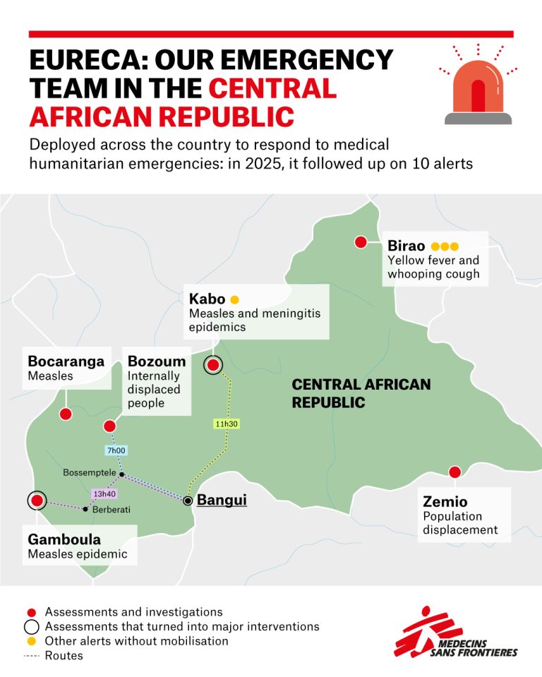 Created in January 2014 and based in Bangui, EURECA is Médecins Sans Frontières/Doctors Without Borders (MSF)’s mobile emergency response team in the Central African Republic (CAR). Its mission is to monitor, investigate and respond rapidly to medical and humanitarian emergencies throughout the country, including in the most isolated and difficult-to-reach areas. In a country marked by recurrent crises, a structurally fragile health system and frequent outbreaks of epidemics, EURECA is a central pillar of MSF’s emergency preparedness and response plan.