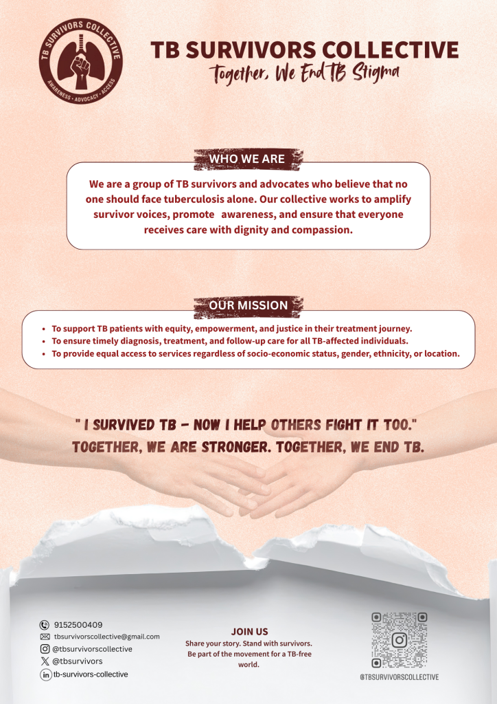 The TB Survivor Collective is a registered Community-Based Organization established in Mumbai in April 2025. Formed and led by TB survivors, the CBO is rooted in the belief that those who have lived through the disease are uniquely equipped to transform the TB response.