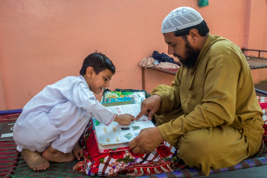 - Shahid Khan helps his son Abdul Rehman with his homework inside their home in Machar Colony. Shahid Khan has successfully completed his hepatitis C treatment, Karachi, Pakistan. ©Asim Hafeez