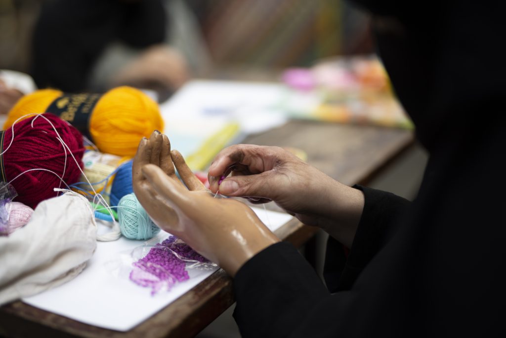 - Aisha (14), from Yemen working on a handcraft artwork in a workshop at the MSF hospital art school. During her latest treatment visit to the hospital, between April-May 2024, Aisha learnt how to make use of her prostethics to gain independence, through occupational therapy sessions. MSF hospital, Amman, Joran. April 2024. ©Rehab Eldalil/MSF