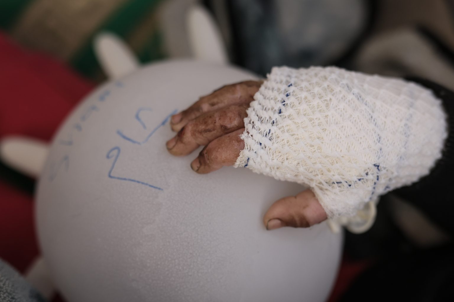 - After finishing Sham’s dressings at the MSF clinic in Gaza City, Belal made her a balloon out of gloves and wrote her name on it in Arabic. ©MSF
