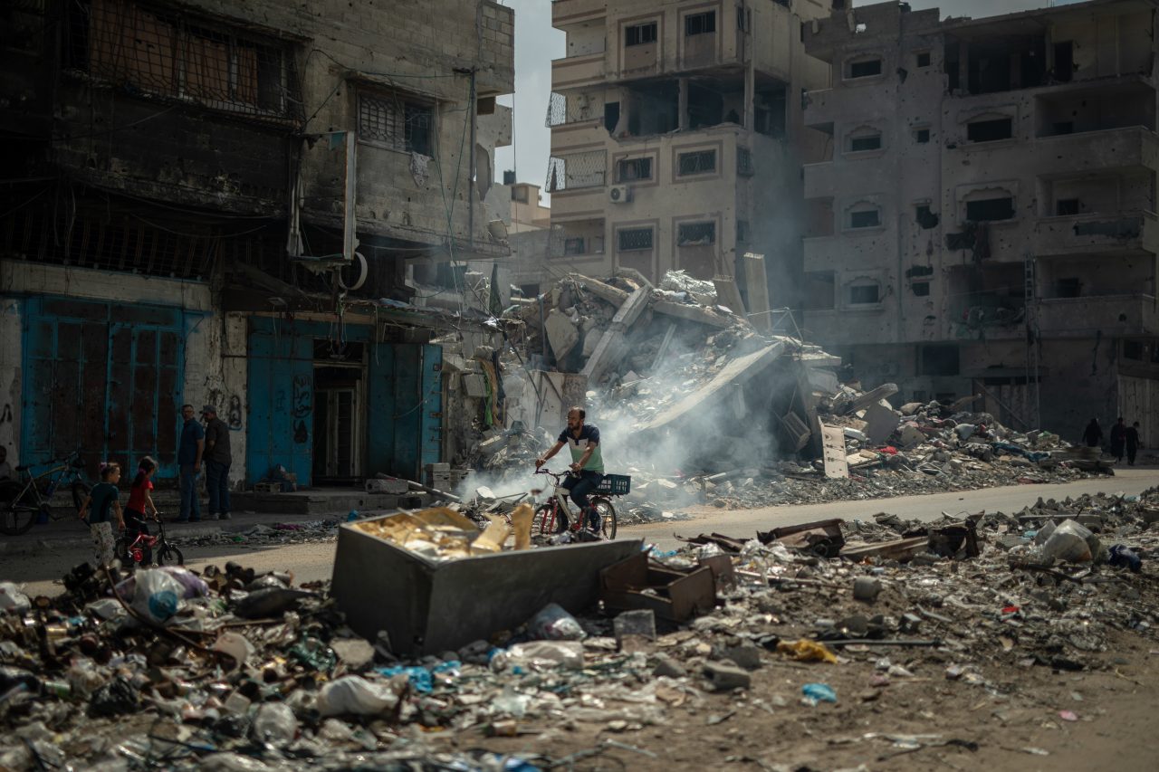 - In Al Shate’ Refugee Camp in Gaza City, a man is riding his bicycle through the midst of the destruction. ©MSF